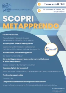 Il prossimo 7 marzo alle ore 14.30 presso la nostra sede associativa si terrà un incontro di presentazione della Piattaforma METAPPRENDO, che mette a disposizione di tutte le aziende metalmeccaniche strumenti utili all’attuazione del diritto soggettivo alla formazione, con lo scopo di sostenere le imprese nell’organizzazione e registrazione della formazione per tutti i lavoratori, rendendo il processo formativo ancora più accessibile, tracciato e flessibile.