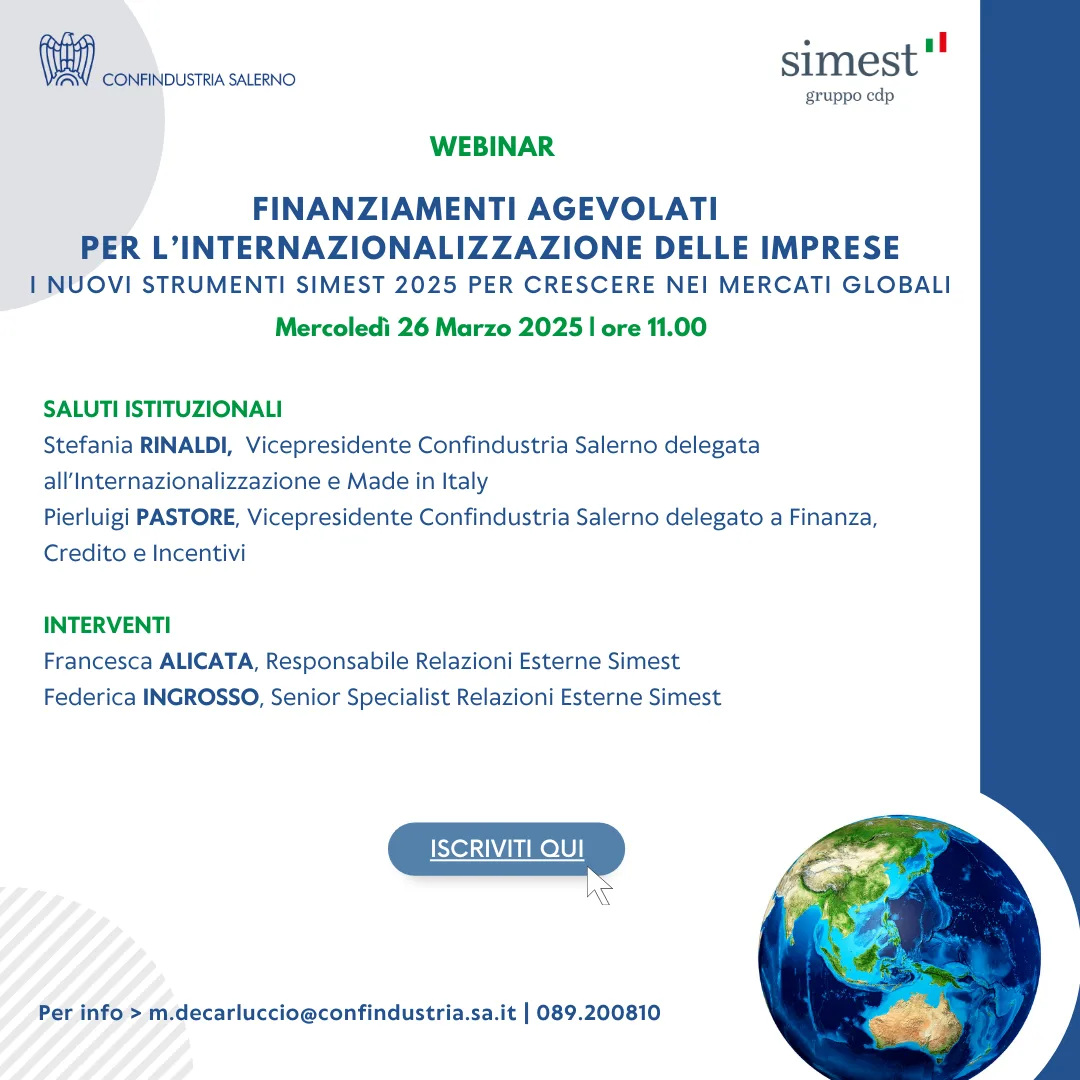 Webinar su “FINANZIAMENTI AGEVOLATI PER L’INTERNAZIONALIZZAZIONE DELLE IMPRESE. I nuovi strumenti SIMEST 2025 per crescere nei mercati globali”