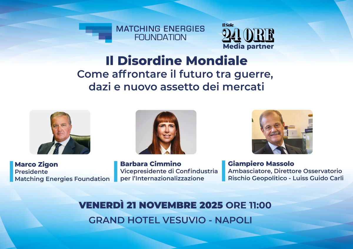 Napoli – Grand Hotel VesuvioPartecipa la vicepresidente di Confindustria con delega all’internazionalizzazione, Stefania Rinaldi Venerdì 21 novembre 2025 Ore 11.00 – , incontro a cura di Matching Energies Foundation con la partecipazione di …