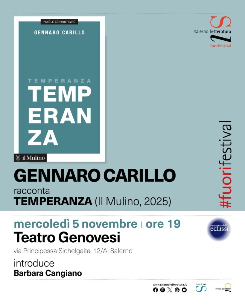 Il prossimo mercoledì 5 novembre alle ore 19 presso il Teatro Genovesi di Salerno si terrà la presentazione del libro Temperanza di Gennaro Carillo, edito da Il Mulino.
