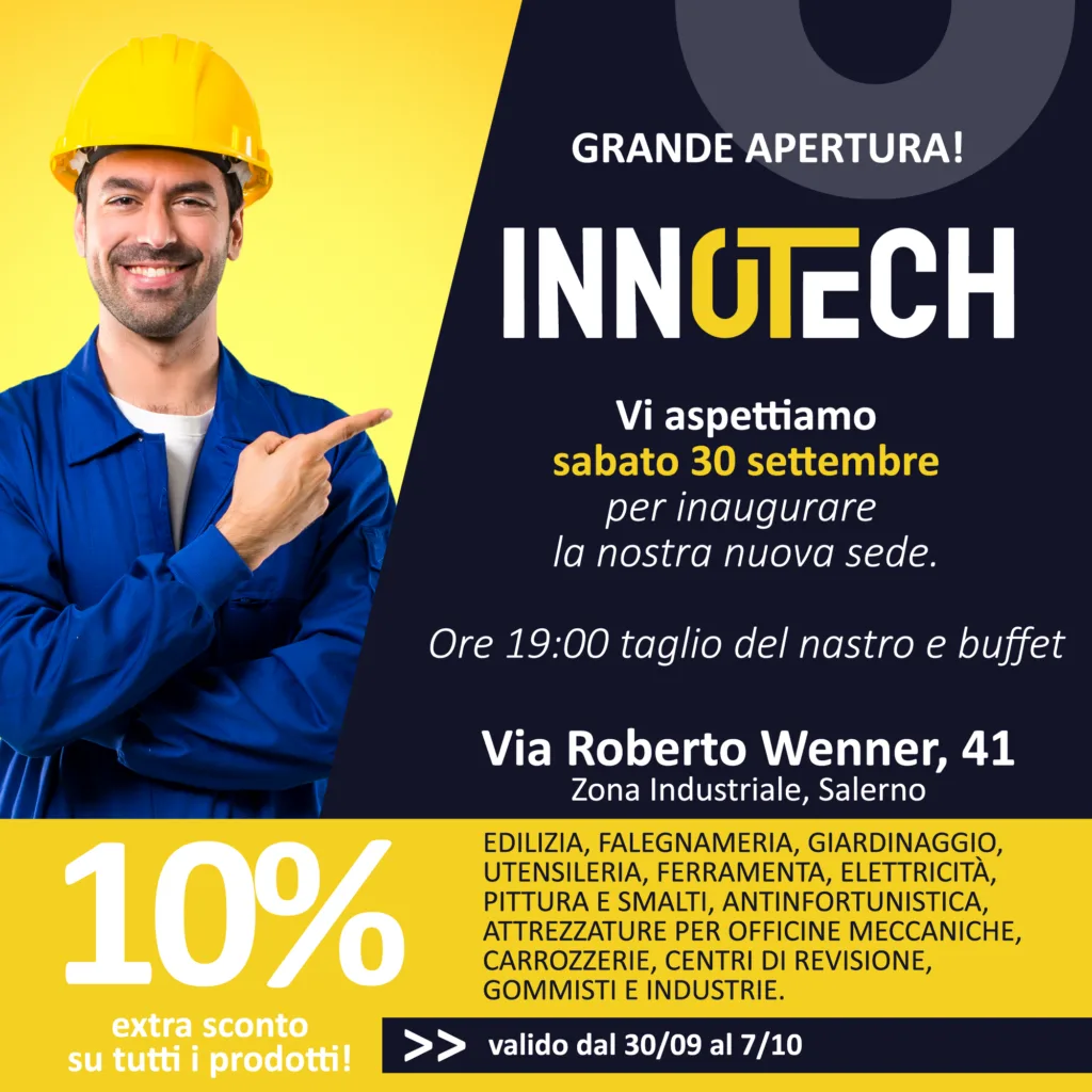 NUOVA APERTURA INNOTECH ITALIA / Le aziende informano / Di Oreste Pastore Settembre 12, 2023La nostra associata INNOTECH ITALIA SRL si trasferisce nella nuova sede nella Zona Industriale di Salerno.Il 30 settembre alle 19 ci sarà l’inaugurazione.Per confermare la propria partecipazione 3938976297 Oreste Pastore