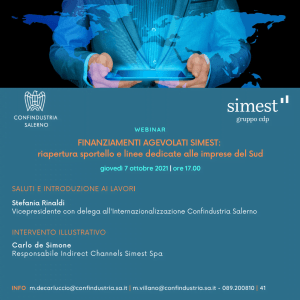 AGEVOLAZIONI|EXPORT – WEBINAR “FINANZIAMENTI AGEVOLATI SIMEST: RIAPERTURA SPORTELLO E LINEE DEDICATE ALLE IMPRESE DEL SUD”, GIOVEDÌ 7 OTTOBRE PV, ORE 17.00