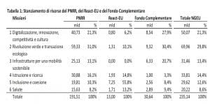 Complessivamente, il PNRR “allargato” (PNRR + React EU + Fondo Complementare) si avvale di 235,1 miliardi, distribuiti sulle 6 Missioni, che sono: